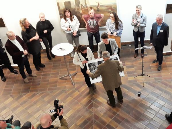 Schüler des Wilhelm-von-Siemens-Gymnasiums aus Marzahn fertigten ein Porträt des Künstlers und überreichten es auf der Vernissage.
