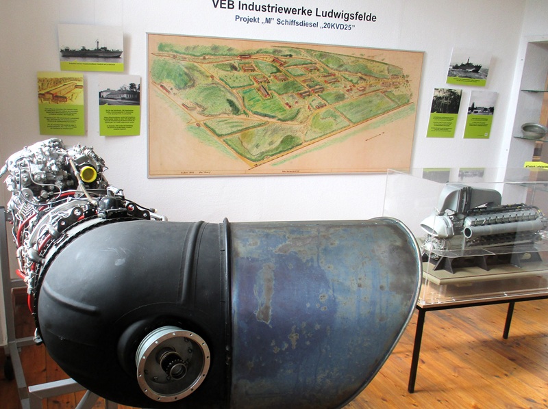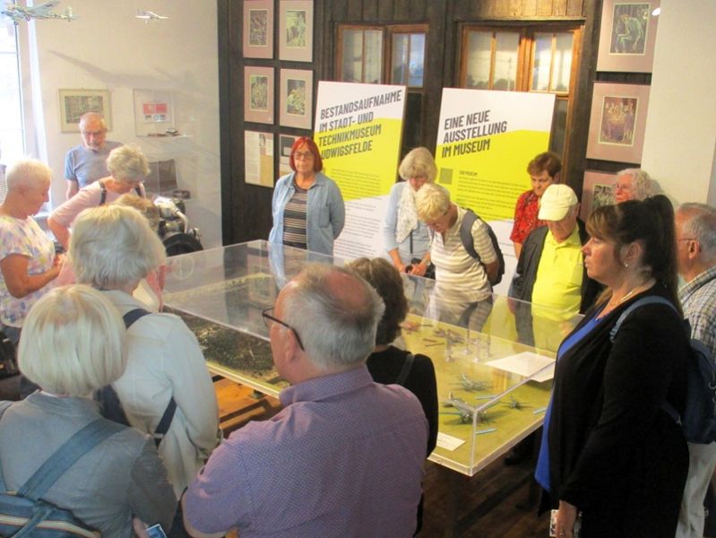 Erste Station war das Stadt- und Technikmuseum Ludwigsfelde. Das Vorstandsmitglied des Heimatvereins Marzahn-Hellersdorf und zugleich Museumsleiter in Ludwigsfelde, Herr Daniel Heimbach, führte fachkundig durch das Museum und gab viele geschichtliche Erklärungen. Den inhaltlichen Schwerpunkt der Dauerausstellung bildet die Industriegeschichte ab 1936. Auf einer Fläche von 500 m² sind Exponate und Modelle aus der Ludwigsfelder Produktion ausgestellt. Exponate sind u.a. Motorroller, der erste W50 aus dem Jahr 1965 und ein L60 von 1988, verschiedene Nutzfahrzeuge von Mercedes Benz, Flugmotoren und Triebwerke, aber auch historische Möbel.