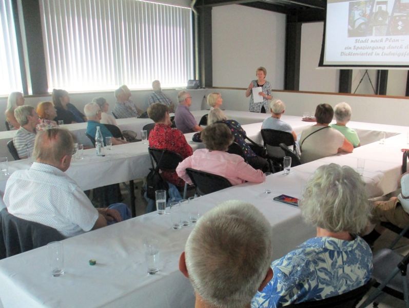 Nach der Führung durch das Museum stellten die Mitglieder des Ludwigsfelder Gesichtsvereins Helga Wunderlich und Hans Christoph Rieth in einem Vortrag das sog. Ludwigsfelder Dichterviertel vor. Gezeigt wurden Bilder, Karten und Zeichnungen zur Baugeschichte. Die Ausführungen wurden ergänzt durch Dr. Gabriele Stolz, deren Vater als Architekt an der Stadtgestaltung beteiligt war.