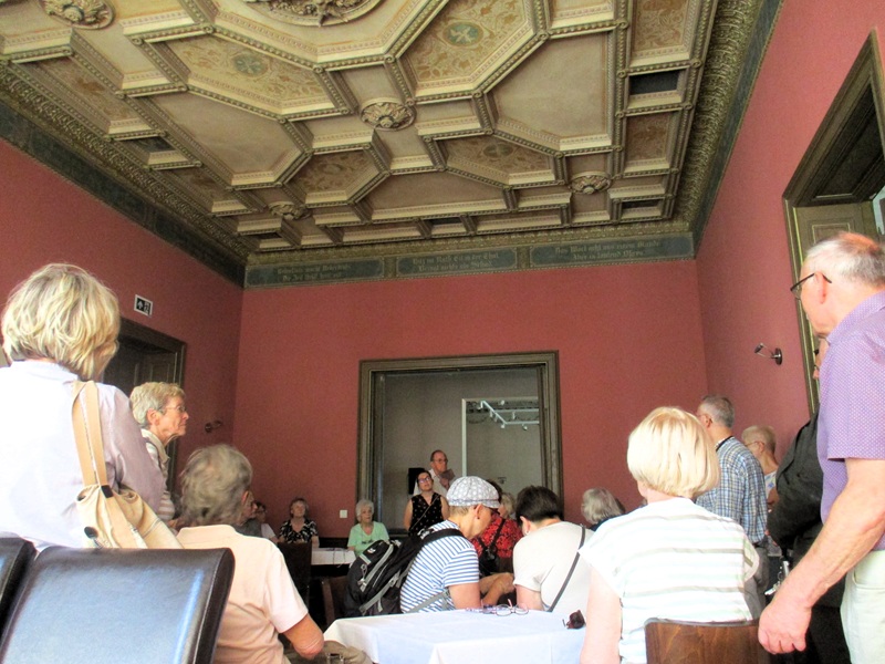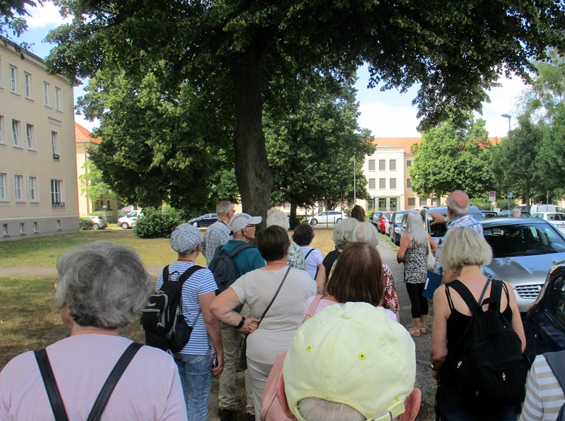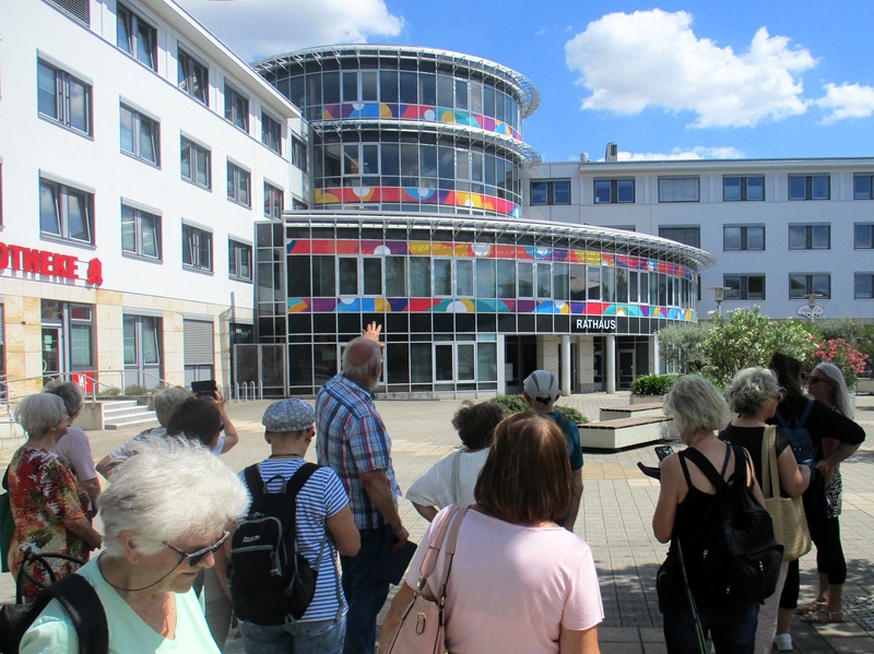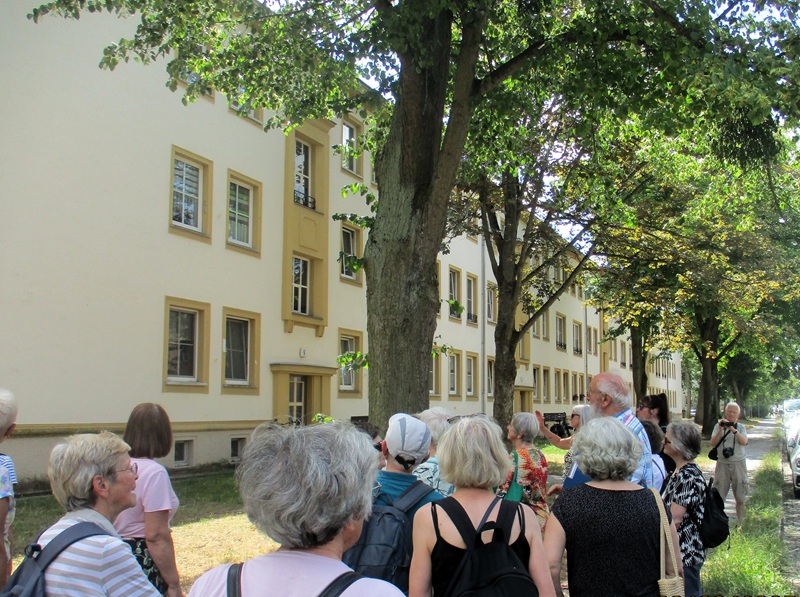Nächste Station war nun eine Führung durch das Dichterviertel, errichtet in den 1950er-Jahren. Der Rundgang führte durch die Albert-Tanneur-Straße, Goethestraße, Heinrich-Heine-Platz, Maxim-Gorki-Straße, Theodor-Fontane-Straße und endete am Platz vor dem Klubhaus. Die Teilnehmer besichtigten Häusern des ersten Bauabschnitts und deren besondere Bauformen und künstlerischen Accessoires und die Fontaneschule. Auch die Straßengestaltung wurde erklärt, die anfangs vorhandenen Einkaufsmöglichkeiten und die Besonderheiten des Kaufhauses. Die vielen Fragen wurden von Frau Winderlich und Herrn Rieth kenntnisreich beantwortet.