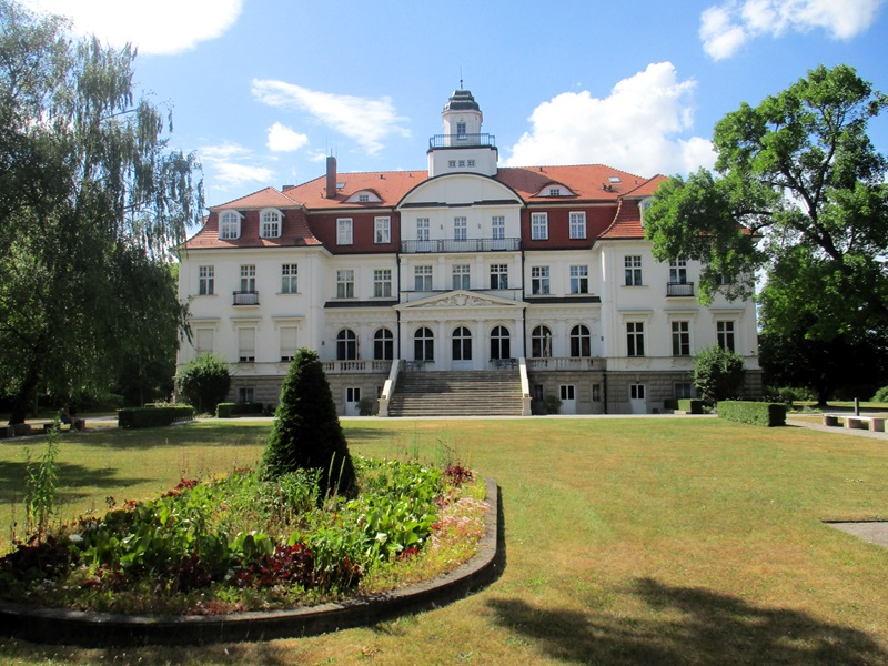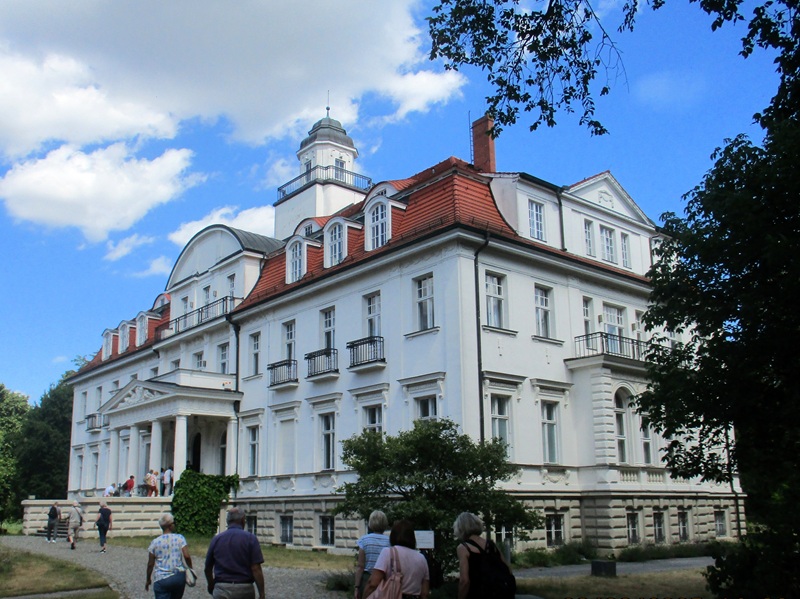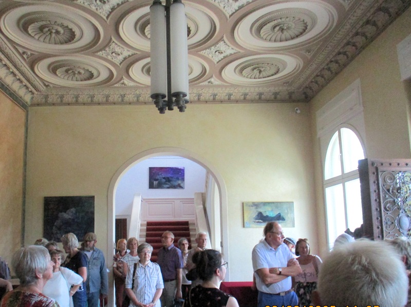 Die Busfahrt führte danach zum Schloss Genshagen. Das Schloss wurde 1878 bis 1880 auf dem Fundament eines vermutlich um 1700 erbauten Herrenhauses errichtet und von 1910 bis 1912 umgebaut und erweitert. Der 7,5 ha große Park wurde in Anlehnung an die englische Landschaftsparkgestaltung angelegt. Das Schloss wird heute betrieben durch die Stiftung Genshagen und ist ein Ort der Begegnung und des Dialogs zwischen Politik, Wirtschaft, Wissenschaft, Kultur und Medien. Durch das Schloss führte Frau Stephanie Jakowetz.