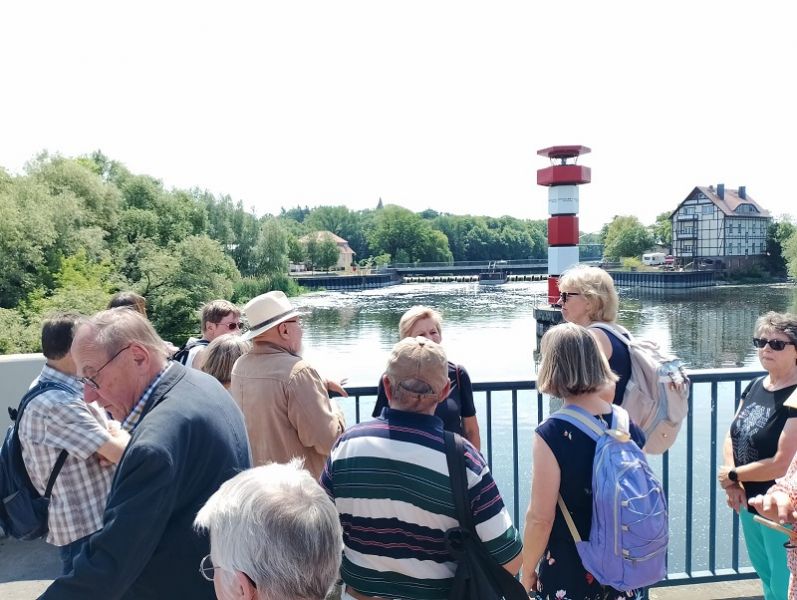 Die anschließende Stadtführung durch die Alt- und Neustadt wurde durch unser Vorstandsmitglied Albrecht Voigt vorgenommen. Er ist Rathenow besonders verbunden, da er hier von 1965 bis 1969 als Stadtrat wirkte. Die Route führte vom Kulturzentrum über August-Bebel-Platz, Kurfürstendenkmal, Stadtschleuse, Alter Stadthafen, Kirchplatz mit St.-Andreas-Kirche, Dunckerdenkmal und historischen Häusern zur Rathenower Havel. Während der Führung war viel über die Geschichte Rathenows zu erfahren.