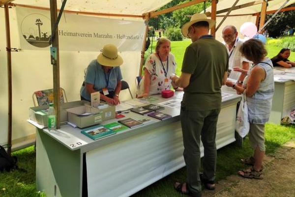 Auf der Gratulanten Meile war auch der Heimatverein Marzahn-Hellersdorf mit einem Stand vertreten. Angeboten wurde die neuste Veröffentlichung des Heimatvereins die Publikation „40 Jahre Marzahn-Hellersdorf – Eine Chronik“, mit der der Heimatverein einen ganz besonderen Beitrag zum 40. Geburtstag des Bezirkes leistet.
