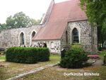 Letzte Station war das 2 Kilometer entfernte Birkholz, ein Ortsteil der Stadt Bernau. Herr JürgenLöffler vom Gemeindekirchenrat erläuterte die Geschichte der Kirche, des Dorfes und des Stadtgutes. Um 1266 wurde die Birkholzer Kirche fertiggestellt. Im 15. bzw. 16. Jahrhundert wurden eine Sakristei und eine Leichenhalle angebaut. Im Oktober 1972 wurde der Kirchturm gesprengt. Dabei wurden das angrenzende Kirchenschiff und andere Teile der Kirche zerstört oder stark beschädigt. Erst seit 1990 werden die vorhandenen Kirchteile gesichert und restauriert. Oberstes Ziel ist die Wiederherstellung und Instandhaltung der Kirche.