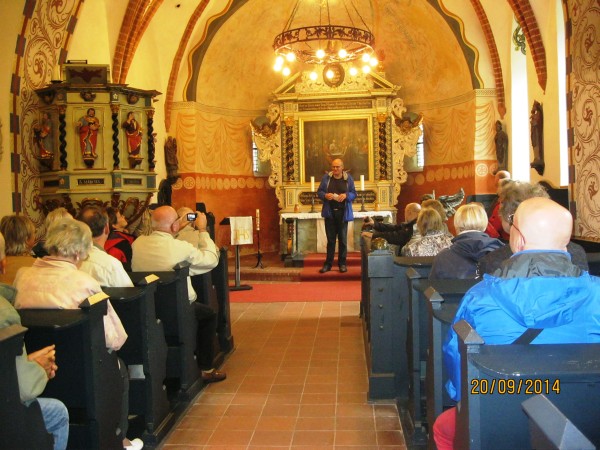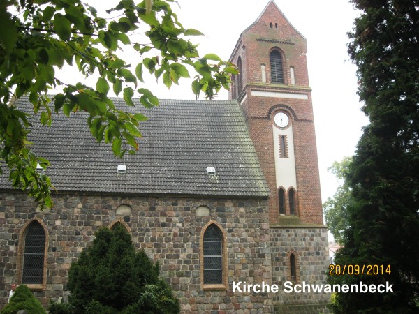 Anschließend führte die Exkursion in das 4 Kilometer entfernte Schwanebeck, ein Ortsteil der Gemeinde Panketal. Klaus Ulrich, Vorstandsmitglied des Fördervereins Dorfkirche Schwanebeck e. V., führte durch die dortige Kirche und gab Erklärungen zum Dorf. Die Kirche ist ein spätromanisches Feldsteinbauwerk aus dem 13. Jahrhundert bestehend aus Schiff, eingezogenem quadratischem Chor und Apsis. In der 2. Hälfte des 19. Jahrhunderts wurde ein quadratischer Turm aus Backstein mit Turmuhr angebaut. Im Inneren befinden sich Kreuzrippengewölbe, ein Flügelaltar aus dem 15. Jahrhundert und Heiligenfiguren. Original erhalten sind die Priesterpforte auf der Nordseite des Chores sowie das vermauerte Südportal im Langhaus.