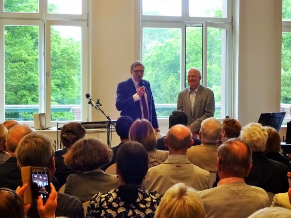 Der Historiker Dr. Oleg Peters und der Schauspieler Peter Bause hielten eine Laudatio auf den Erbauer des Schosses Heino Schmieden. Dabei wurde ein Brief von Schmieden verlesen.