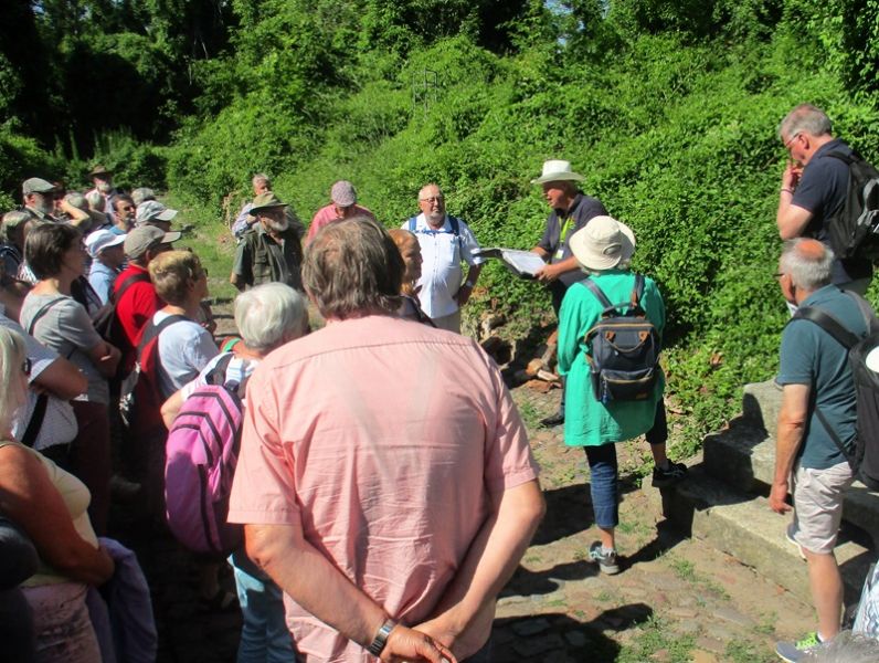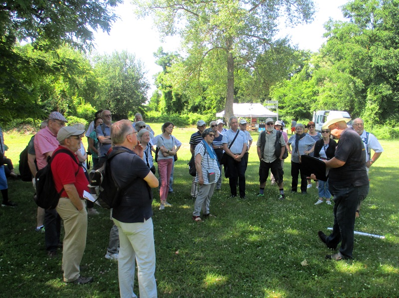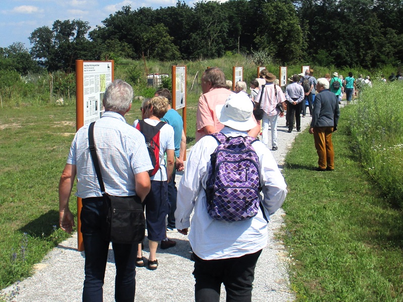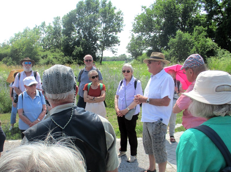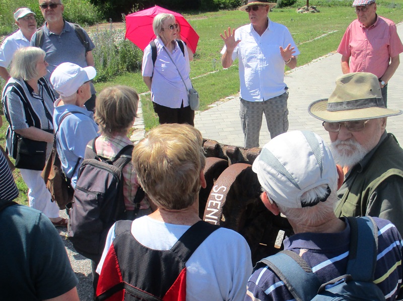 Nach einem herzlichen Dank an Herrn Ahrendt machten wir uns auf den Rückweg, wieder über Frankfurt/Oder, nach Podelzig-Klessin. In Klessin, nun schon bei doch sehr warmer Temperatur, erwartete uns Herr Kaiser von Heimatverein Wuhden. Herr Kaiser führte uns durch die erst am 5. Juni 2023 eröffnete Open Air Gedenkstätte „Kriegsschauplatz Schloss Klessin 1945-Gedenk- und Erinnerungsstätte“. Die Mitglieder des Heimatvereins Wuhden haben diesen Gedenkort in ca. 10.000 Arbeitsstunden mit vielen ehrenamtlichen Mitstreitern, auch aus anderen Vereinen, finanziert u.a. mit Mittel der EU, geschaffen. Zahlreiche Tafeln erinnern an die Geschichte des Ortes von seinen Anfängen an. Der besondere Aspekt liegt jedoch mit Darstellungen unterschiedlicher Art auf den Ereignissen im Frühjahr 1945, als die Schlacht an den Seelower Höhen tobte und sich auch in Klessin eine kleine Gruppe deutscher Soldaten gegen die anrückende Rote Armee verschanzt hatte. Zu den Darstellungen gehören auch Skulpturen, die die Mitglieder des Heimatvereins selbst erdacht und geschaffen haben. Diese symbolisieren das friedliche Leben, den Krieg zuerst weit weg, den sinnlosen Kampf und seine Auswirkungen auf die Menschen und das Land. Durch die erbitterten Kämpfe wurden das Schloss und der Ort so stark zerstört, dass sie nicht wieder aufgebaut wurden, auch weil Granatsplitter, Munitionsreste und Gebeine der Gefallenen, bis heute in der Erde liegen. Herr Kaiser berichtete über diese Ereignisse engagiert und kenntnisreich und darüber wie es dem Heimatverein Wuhden gelungen ist, diese beindruckende Gedenkstätte zu schaffen. Die Mitglieder des Heimatvereins hoffen und wünschen sich, dass vor allem junge Leute sich stärker für dieses Kapitel deutscher Geschichte interessieren. Einen Besuch in Klessin können auch wir sehr empfehlen.