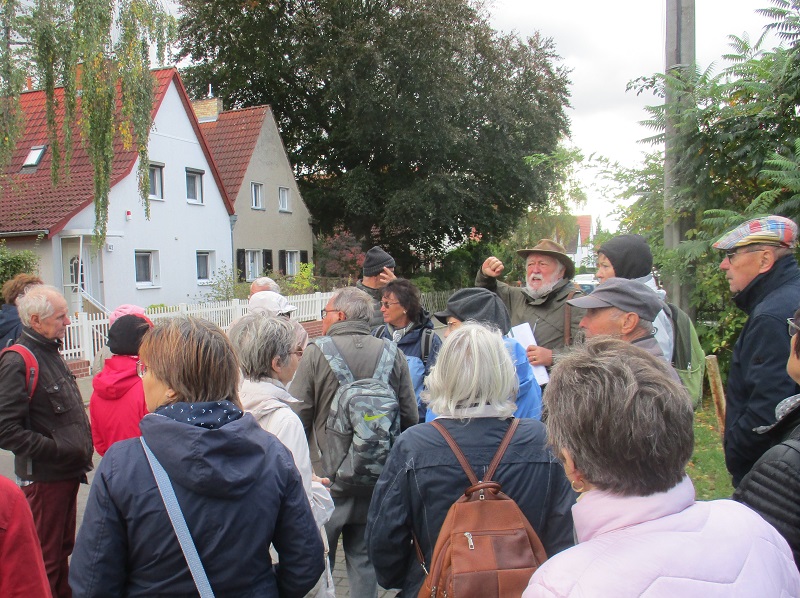 Es folgte die zweite Führung „Als Biesdorf ein kleines Wandlitz war…“ des Heimatvereins durch das Biesdorfer Getreideviertel. Wolfgang Brauer konnte erneut interessante Geschichte vermitteln. Im Mai 1945 wurden für Magistratsmitglieder, Parteifunktionäre und Kulturschaffende östlich der Oberfeldstraße Wohnungen und Häuser zur Verfügung gestellt. Insgesamt wurden 34 Wohnhäuser enteignet. Im Volksmund wurde diese Gegend schnell „Magistratssiedlung“ genannt. Der Rundgang führte an diese Wohnorte, verdeutlichte geschichtliche Zusammenhänge und rückte in Vergessenheit geratene Personen wieder in das Blickfeld.