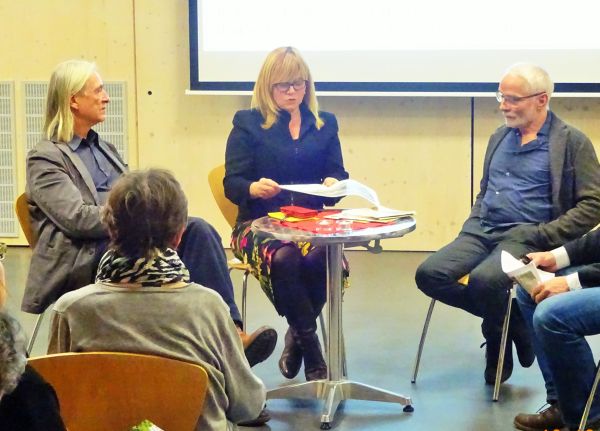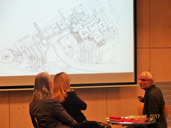 Danach luden Juliane Witt (Bezirksstadträtin) und Dr. Oleg Peters (Leiter Standort- marketing) zu einem Podiumsgespräch mit den Architekten Michael Kny und Thomas Weber. Sie waren an der damaligen Planung beteiligt und schilderten ihre Erlebnisse. Trotz aller Schwierigkeiten und Enttäuschungen waren sie begeistert von den experimentellen Möglichkeiten, dem hohen Budget und dem kameradschaft-lichen Umgang. Gemeinsam gründeten sie 1990 ein Architektenbüro. Kny und Weber beteiligten sich an ca. 60 Wettbewerben, gewonnen 17 erste Preise und können ein breites Arbeitsspektrum vorweisen. Einige Bauprojekte sind auch in Marzahn-Hellersdorf entstanden.