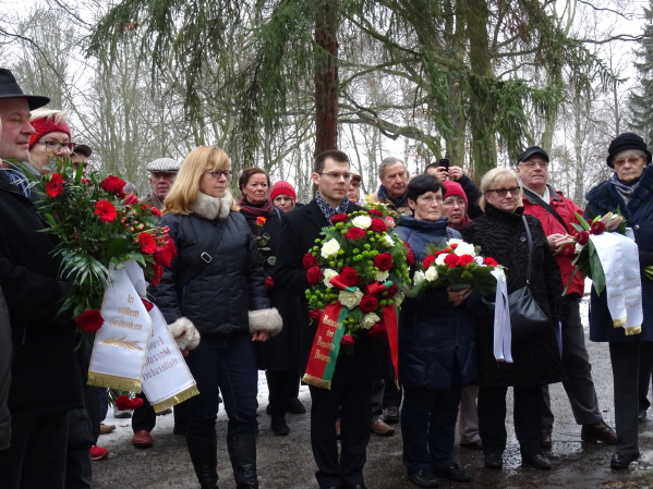 Anlässlich des Gedenktages für die Opfer des Nationalsozialismus und der Befreiung des Konzentrationslagers Auschwitz durch die Rote Armee am 27. Januar 1945 trafen sich am 21. Januar 2017 ca. 60 Bürgerinnen und Bürger des Bezirkes zum stillen Gedenken an der Stele für die Zwangsarbeiter_innen auf dem Parkfriedhof Marzahn.