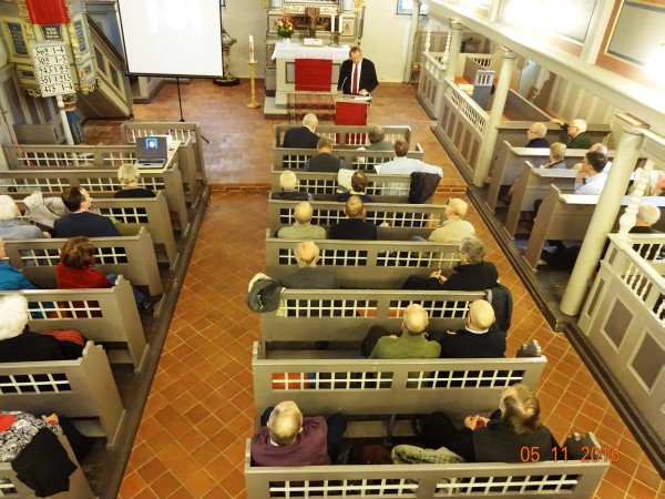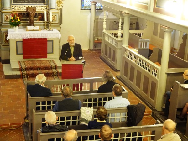 Der diesjährige „Tag der Regional- und Heimatgeschichte“ widmete sich dem Thema „Zur Kirchengeschichte von Marzahn-Hellersdorf“ und fand in der Jesuskirche in Kaulsdorf statt. Wolfgang Brauer, der Vorsitzende des Heimatvereins Marzahn-Hellersdorf v. V., begrüßte die reichlich 60 Anwesenden, unter ihnen Bezirksstadtrat Stephan Richter und VertreterInnen der gastgebenden evangelischen Kirchengemeinde. Anlass für die Wahl des Themas, so bemerkte Wolfgang Brauer, ist das Reformationsjubiläumssjahr, außerdem sei es das erste Mal, dass sich der Heimatverein Marzahn-Hellersdorf umfassend mit der Kirchengeschichte in unserem Territorium beschäftigt. In Grußworten wünschten Dr. Markus Dröge, Bischof der Evangelischen Kirche Berlin-Brandenburg-schlesische Oberlausitz, und Juliane Witt, Bezirksstadträtin für Kultur, der Veranstaltung einen guten Verlauf. Pastorin Steffi Jawer wies in ihrem Grußwort darauf hin, dass die Jesuskirche Kaulsdorf eine der ältesten Kirchen in Berlin ist, mit einer wechselvollen Geschichte. Die Gemeinde setzt sich heute, in der Nachfolge von Heinrich Grüber, für einen nachhaltigen Umgang mit der Umwelt ein und engagiert sich seit etwa einem Jahr für Geflüchtete. Joachim Klee, ebenfalls von der evangelischen Gemeinde Kaulsdorf, informierte über das Turmmuseum, das 2000 eröffnet wurde. Es beherbergt eine Ausstellung über Geschichte von Kirche und Gemeinde und bietet einen schönen Ausblick auf Kaulsdorf.