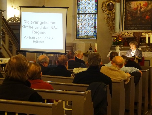 Prof. Wolf R. Eisentraut führte durch den weiteren Verlauf der Veranstaltung. Wolfgang Brauer wandte sich in einem einleitenden Überblick dem Thema „Die Reformation in Brandenburg“ zu und sprach von einer „erzwungenen“ Reformation in der Kurbrandenburg nach dem „Thesenanschlag“ von Martin Luther. Er umriss das Ringen um den neuen Glauben bis in die 30er-Jahre des 16. Jahrhunderts und bis zur Einführung der Reformation in Brandenburg 1539. Pfarrer Ingolf Göbel schilderte in seinem Beitrag die Vorgeschichte und die Umsetzung „Der Marzahner Kirchenunion von 1832/35“, in der in einem von König Friedrich Wilhelm III. in seinem Lande initiierten Prozess auch die lutherische und die reformierte Gemeinde vereint wurde. Die beiden Gemeinden bestanden seit dem Zuzug von Siedlern aus der Pfalz im Jahre 1764. Horst Rubin widmete seinen Beitrag dem Pfarrer und Superintendenten Adalbert Hosemann, der von 1886 bis zu seinem Tode 1906 als Pfarrer in Biesdorf und dessen Filialkirchen Kaulsdorf und Mahlsdorf wirkte. Karin Satke zeigte in ihrem Beitrag „St. Martin Kaulsdorf-Mahlsdorf – die erste katholische Kirche nach der Reformation“ auf, unter welchen Schwierigkeiten Menschen katholischen Glaubens, die seit dem 18. Jahrhundert zahlreicher in Berlin ansässig wurden, ihren Glauben ausübten. Privatwohnungen, Gaststätten und Bodenkammern mussten vor dem Bau von Kirchen für den Gottesdienst genutzt werden. Die nach Plänen von Josef Bachem errichtete St. Martinskirche in der Giesestraße konnte 1930 feierlich geweiht werden. Dr. Christa Hübner verdeutlichte in ihrem Beitrag „Die evangelische Kirche und das NS-Regime“ Absicht und Methoden der NS-Machthaber, Kirche für ihre Zwecke zu gebrauchen und wie weit das gelang bzw. nicht gelang. André Gaedecke befasste sich mit dem „staatlichen Umgang mit den Kirchen in den 1950er-Jahren“ am Beispiel des Biesdorfer Jesuitenprozesses 1958. Harald Kintscher sprach über das Wirken des „Pfarrerehepaars Gundula und Anselm Tietsch“. Anselm Tietsch war von 1949 bis 1955 Pfarrer in Mahlsdorf-Süd, seine Frau Gundula wirkte im Marzahner Neubaugebiet zu einer Zeit, als es noch keine neuen Kirchenbauten gab und sich die Gläubigen in Wohnungen zu sogenannten Hauskreisen trafen. Pfarrer Hartmut Scheel gab einen Überblick über „die evangelische Kirchengemeinde Hellersdorf in den 1980er/1990er-Jahren“. Auch hier kamen die Gläubigen zunächst in Hauskreisen in Wohnungen zusammen, bis, noch zu DDR-Zeiten geplant und nach der Wende gebaut, am Rande der Neubausiedlung das Gemeindezentrum eingeweiht werden konnte.