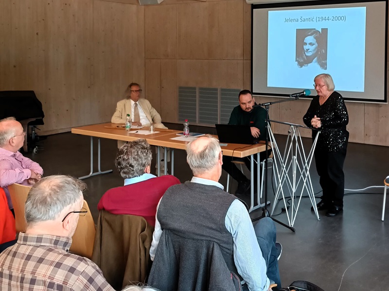 Renate Schilling richtete in ihren Beitrag „Jelena-Šantić-Friedenspark“ die Aufmerksamkeit auf ein bisher wenig bekanntes Kapitel in der neusten Geschichte Hellersdorfs. Der „Jelena-Šantić-Friedenspark“ wurde 2003 nach einer bosnischen Friedensaktivistin benannt. Vorher hieß der Park Rohrbruchpark, der durch den Aushub für das Zentrum Helle Mitte, in der Nähe der heutigen Seilbahnstation, entstanden war. Der Namensgebung war im Mai 1999 die Anlegung eines weithin sichtbaren Peacezeichen vor allem durch junge Menschen, vorausgegangen. An dieser Aktion hatte Jelena Šantić  teilgenommen. Das Peacezeichen wurde als Symbol des Protestes gegen die Beteiligung der NATO am Krieg in Ex-Jugoslawien aber auch als Zeichen der Solidarität mit Geflüchteten errichtet. In der anschließenden Diskussion gab es Nachfragen zu Jelena Šantić und es wurde der Vorschlag unterbreitet, da der 18.3.2025 ihr 25. Todestag ist, an diesen zu erinnern.