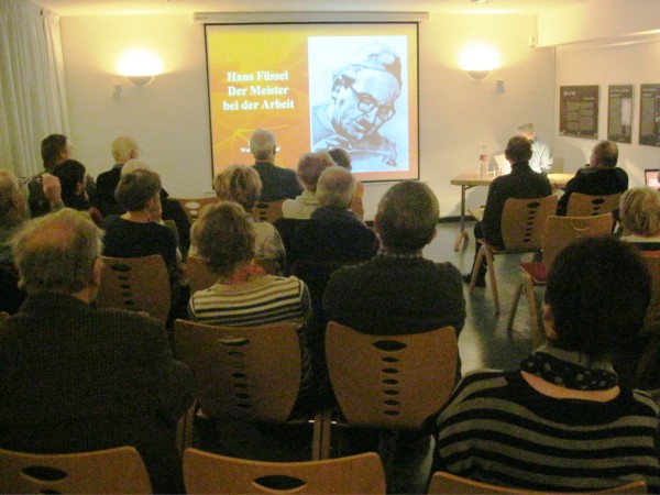 Das Marzahn-Hellersdorfer Gespräch zur Geschichte vom 10. Februar 2016 stellte den in Kaulsdorf wohnenden und schaffenden Bildhauer, Metallgießer und Poeten Hans Füssel vor. Karin Satke, Mitglied des Heimatvereins Marzahn-Hellersdorf und Ortschronistin von Kaulsdorf, referierte über das Leben und Werk von Füssel. An passenden Stellen zitierte sie aus dem poetischen Schaffen von Füssel.