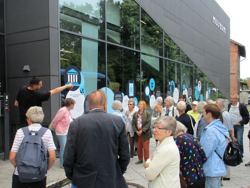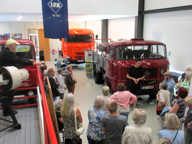Erste Station war das Stadt- und Technikmuseum Ludwigsfelde. Das Vorstandsmitglied des Heimatvereins Marzahn-Hellersdorf und zugleich Museumsleiter in Ludwigsfelde, Herr Daniel Heimbach, führte fachkundig durch das Museum und gab viele geschichtliche Erklärungen. Den inhaltlichen Schwerpunkt der Dauerausstellung bildet die Industriegeschichte ab 1936. Auf einer Fläche von 500 m² sind Exponate und Modelle aus der Ludwigsfelder Produktion ausgestellt. Exponate sind u.a. Motorroller, der erste W50 aus dem Jahr 1965 und ein L60 von 1988, verschiedene Nutzfahrzeuge von Mercedes Benz, Flugmotoren und Triebwerke, aber auch historische Möbel.