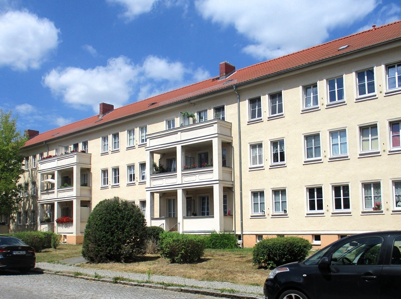 Nächste Station war nun eine Führung durch das Dichterviertel, errichtet in den 1950er-Jahren. Der Rundgang führte durch die Albert-Tanneur-Straße, Goethestraße, Heinrich-Heine-Platz, Maxim-Gorki-Straße, Theodor-Fontane-Straße und endete am Platz vor dem Klubhaus. Die Teilnehmer besichtigten Häusern des ersten Bauabschnitts und deren besondere Bauformen und künstlerischen Accessoires und die Fontaneschule. Auch die Straßengestaltung wurde erklärt, die anfangs vorhandenen Einkaufsmöglichkeiten und die Besonderheiten des Kaufhauses. Die vielen Fragen wurden von Frau Winderlich und Herrn Rieth kenntnisreich beantwortet.