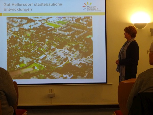 Marina Dreßler, Leiterin des Fachbereiches Stadtplanung im Stadtentwicklungsamt Marzahn-Hellersdorf, veranschaulichte anhand von Bildmaterial die städtebauliche Entwicklung des historischen Gutsbereiches Hellersdorf, insbesondere unter Berücksichtigung der denkmalpflegerischen Belange und der identitätsstiftenden Bedeutung für die Großsiedlung Hellersdorf.