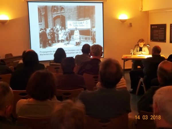 Am 14. März 2018 lud das Bezirksmuseum Marzahn-Hellersdorf zum dritten Gespräch zur Geschichte. Frau Dr. Christa Hübner, Historikerin und Stellverteretende Vorsitzende des Heimatvereins Marzahn-Hellersdorf e.V., referierte zum Thema „Die evangelische Kirche und das NS-Regime“. Der Vortrag war eine Begleitveranstaltung zur gegenwärtigen Sobderausstellung „Gott und die Welt. Zur Kirchengeschichte von Marzahn-Hellersdorf“ im Haus 1 des Bezirksmuseums.