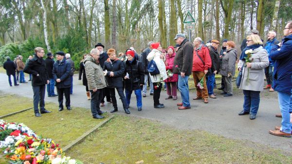 Aus Anlass des Gedenktages für die Opfer des Nationalsozialismus und der Befreiung des Konzentrationslagers Auschwitz durch die Rote Armee am 27. Januar 1945 fand am 27. Januar 2018 das jährliche Stille Gedenken an der Stele für die Zwangsarbeiterinnen und Zwangsarbeiter auf dem Parkfriedhof Marzahn statt. Eingeladen hatten die Bezirksverordnetenversammlung,der Heimatverein und das Bezirksamt von Marzahn-Hellersdorf. Der Vorsitzende des Heimatvereins Wolfgang Brauer und der stellvertretende Vorsteher der BVV Klaus-Jürgen Dahler begrüßten die ca. 50 Anwesenden. Unter diesen waren Vertreter der Botschaft von Belarus und Russlands sowie eine Vertreterin der Botschaft der USA, die Bundestagsvizepräsidentin Petra Pau, die Vizepräsidentin des Berliner Abgeordnetenhauses Dr. Manuela Schmidt, Bürgermeisterin Dagmar Pohle, die Bezirksstadträte Juliane Witt, Gordon Lemm und Thomas Braun, das Mitglied des Berliner Abgeordnetenhauses Kristian Ronneburg, Kameradinnen und Kameraden des VVN-BdA, Mitglieder der BVV-Fraktionen der LINKEN, der SPD, von Bündnis 90/Die Grünen und der AfD, des Heimatvereins Marzahn-Hellersdorf und der Seniorenvertretung des Bezirkes. Worte des Gedenkens sprach Bürgermeisterin Dagmar Pohle. Sie erinnerte an die unvorstellbar große Zahl der Opfer des Nationalsozialismus, vor allem an die jüdischen. Zu den Opfern zählten auch Zwangsarbeiterinnen und Zwangsarbeiter aus vielen Ländern Europas. Auch in unserem Bezirk waren Tausende von ihnen in Lagern untergebracht, jede und jeder konnte sie sehen. Zahlreiche Gebinde und Blumen wurden an der Stele niedergelegt. Der Vorsitzende des Heimatvereins Wolfgang Brauer bedankte sich bei den Anwesenden für ihre Teilnahme an der Gedenkveranstaltung.