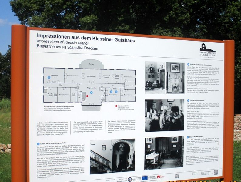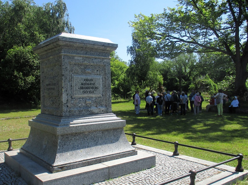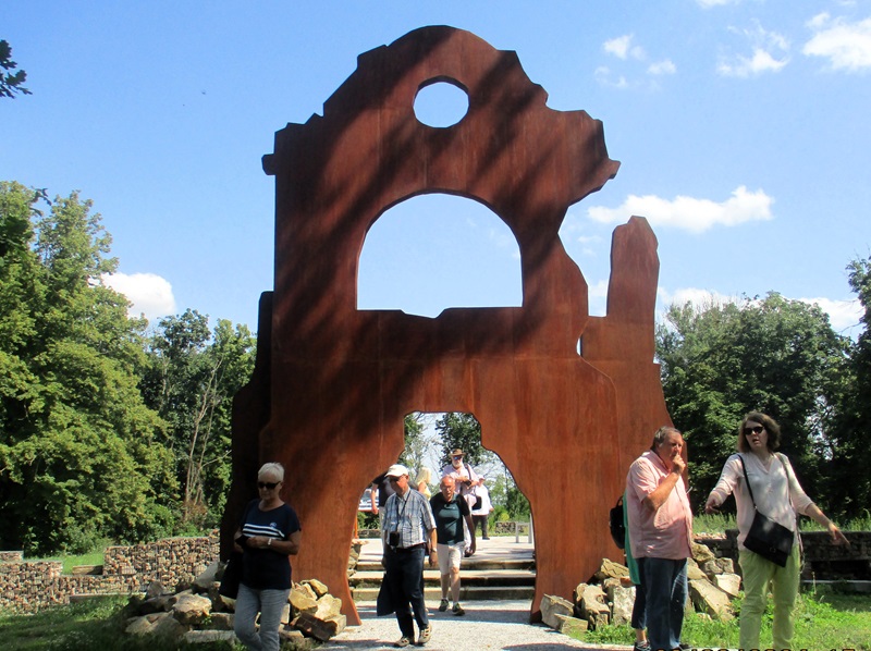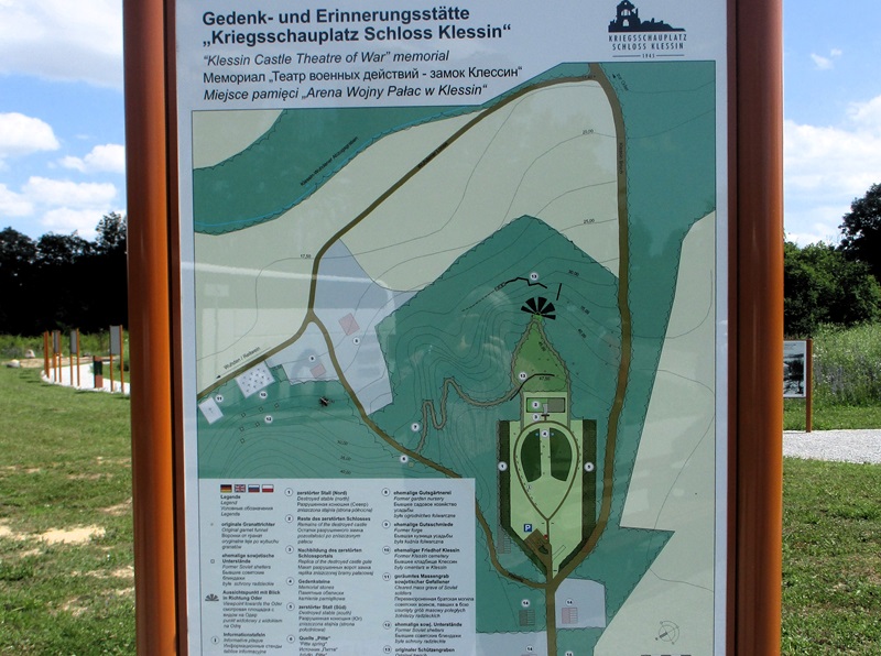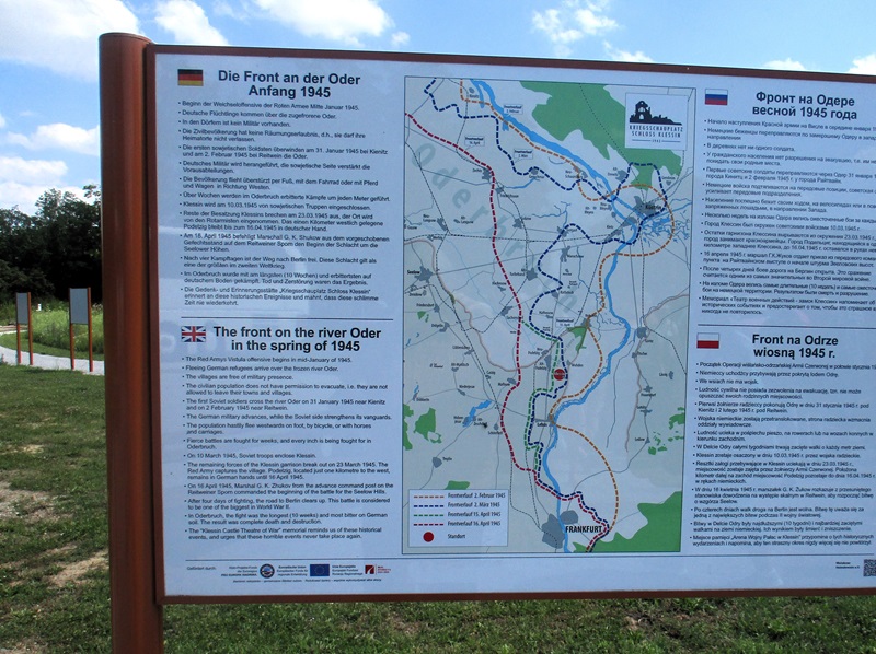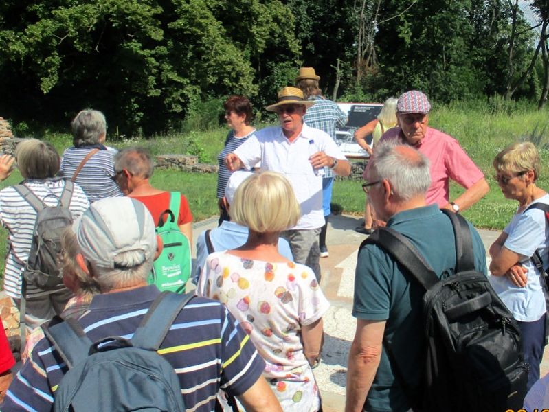Nach einem herzlichen Dank an Herrn Ahrendt machten wir uns auf den Rückweg, wieder über Frankfurt/Oder, nach Podelzig-Klessin. In Klessin, nun schon bei doch sehr warmer Temperatur, erwartete uns Herr Kaiser von Heimatverein Wuhden. Herr Kaiser führte uns durch die erst am 5. Juni 2023 eröffnete Open Air Gedenkstätte „Kriegsschauplatz Schloss Klessin 1945-Gedenk- und Erinnerungsstätte“. Die Mitglieder des Heimatvereins Wuhden haben diesen Gedenkort in ca. 10.000 Arbeitsstunden mit vielen ehrenamtlichen Mitstreitern, auch aus anderen Vereinen, finanziert u.a. mit Mittel der EU, geschaffen. Zahlreiche Tafeln erinnern an die Geschichte des Ortes von seinen Anfängen an. Der besondere Aspekt liegt jedoch mit Darstellungen unterschiedlicher Art auf den Ereignissen im Frühjahr 1945, als die Schlacht an den Seelower Höhen tobte und sich auch in Klessin eine kleine Gruppe deutscher Soldaten gegen die anrückende Rote Armee verschanzt hatte. Zu den Darstellungen gehören auch Skulpturen, die die Mitglieder des Heimatvereins selbst erdacht und geschaffen haben. Diese symbolisieren das friedliche Leben, den Krieg zuerst weit weg, den sinnlosen Kampf und seine Auswirkungen auf die Menschen und das Land. Durch die erbitterten Kämpfe wurden das Schloss und der Ort so stark zerstört, dass sie nicht wieder aufgebaut wurden, auch weil Granatsplitter, Munitionsreste und Gebeine der Gefallenen, bis heute in der Erde liegen. Herr Kaiser berichtete über diese Ereignisse engagiert und kenntnisreich und darüber wie es dem Heimatverein Wuhden gelungen ist, diese beindruckende Gedenkstätte zu schaffen. Die Mitglieder des Heimatvereins hoffen und wünschen sich, dass vor allem junge Leute sich stärker für dieses Kapitel deutscher Geschichte interessieren. Einen Besuch in Klessin können auch wir sehr empfehlen.