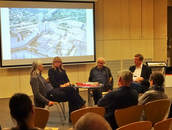 Danach luden Juliane Witt (Bezirksstadträtin) und Dr. Oleg Peters (Leiter Standort- marketing) zu einem Podiumsgespräch mit den Architekten Michael Kny und Thomas Weber. Sie waren an der damaligen Planung beteiligt und schilderten ihre Erlebnisse. Trotz aller Schwierigkeiten und Enttäuschungen waren sie begeistert von den experimentellen Möglichkeiten, dem hohen Budget und dem kameradschaft-lichen Umgang. Gemeinsam gründeten sie 1990 ein Architektenbüro. Kny und Weber beteiligten sich an ca. 60 Wettbewerben, gewonnen 17 erste Preise und können ein breites Arbeitsspektrum vorweisen. Einige Bauprojekte sind auch in Marzahn-Hellersdorf entstanden.
