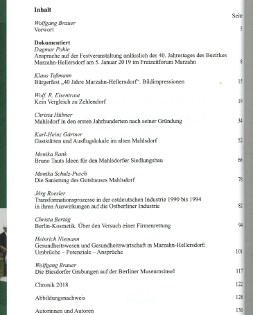 Neben den Autorinnen und Autoren möchte ich an dieser Stelle allen Persönlichkeiten und Institutionen Dank sagen, die uns die Nutzung ihrer Bildquellen gestatteten. Mein Dank gebührt dem Redaktionsteam und allen, die uns mit Rat und Tat zur Seite standen, besonders den Mitarbeiterinnen des Bezirksmuseums. Waldemar-Vincenty Seifert danken wir für die wie immer ausgezeichnete Gestaltung. Wir danken dem Senator für Kulturelle Angelegenheiten und dem Bezirksamt Marzahn-Hellersdorf für die Unterstützung unseres Projektes mit Mitteln des Bezirkskulturfonds des Landes Berlin.