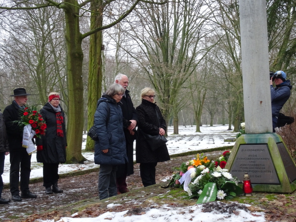 Anlässlich des Gedenktages für die Opfer des Nationalsozialismus und der Befreiung des Konzentrationslagers Auschwitz durch die Rote Armee am 27. Januar 1945 trafen sich am 21. Januar 2017 ca. 60 Bürgerinnen und Bürger des Bezirkes zum stillen Gedenken an der Stele für die Zwangsarbeiter_innen auf dem Parkfriedhof Marzahn.