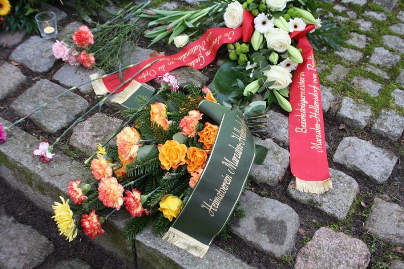 Anlässlich des Gedenktages für die Opfer des Nationalsozialismus legte der Vorstand des Heimatvereins Marzahn-Hellersdorf e.V. am 27. Januar 2021 an der Zwangsarbeiter-Gedenkstele auf dem Parkfriedhof in Marzahn ein Gebinde nieder.