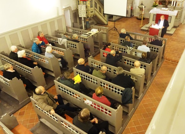 Prof. Wolf R. Eisentraut führte durch den weiteren Verlauf der Veranstaltung. Wolfgang Brauer wandte sich in einem einleitenden Überblick dem Thema „Die Reformation in Brandenburg“ zu und sprach von einer „erzwungenen“ Reformation in der Kurbrandenburg nach dem „Thesenanschlag“ von Martin Luther. Er umriss das Ringen um den neuen Glauben bis in die 30er-Jahre des 16. Jahrhunderts und bis zur Einführung der Reformation in Brandenburg 1539. Pfarrer Ingolf Göbel schilderte in seinem Beitrag die Vorgeschichte und die Umsetzung „Der Marzahner Kirchenunion von 1832/35“, in der in einem von König Friedrich Wilhelm III. in seinem Lande initiierten Prozess auch die lutherische und die reformierte Gemeinde vereint wurde. Die beiden Gemeinden bestanden seit dem Zuzug von Siedlern aus der Pfalz im Jahre 1764. Horst Rubin widmete seinen Beitrag dem Pfarrer und Superintendenten Adalbert Hosemann, der von 1886 bis zu seinem Tode 1906 als Pfarrer in Biesdorf und dessen Filialkirchen Kaulsdorf und Mahlsdorf wirkte. Karin Satke zeigte in ihrem Beitrag „St. Martin Kaulsdorf-Mahlsdorf – die erste katholische Kirche nach der Reformation“ auf, unter welchen Schwierigkeiten Menschen katholischen Glaubens, die seit dem 18. Jahrhundert zahlreicher in Berlin ansässig wurden, ihren Glauben ausübten. Privatwohnungen, Gaststätten und Bodenkammern mussten vor dem Bau von Kirchen für den Gottesdienst genutzt werden. Die nach Plänen von Josef Bachem errichtete St. Martinskirche in der Giesestraße konnte 1930 feierlich geweiht werden. Dr. Christa Hübner verdeutlichte in ihrem Beitrag „Die evangelische Kirche und das NS-Regime“ Absicht und Methoden der NS-Machthaber, Kirche für ihre Zwecke zu gebrauchen und wie weit das gelang bzw. nicht gelang. André Gaedecke befasste sich mit dem „staatlichen Umgang mit den Kirchen in den 1950er-Jahren“ am Beispiel des Biesdorfer Jesuitenprozesses 1958. Harald Kintscher sprach über das Wirken des „Pfarrerehepaars Gundula und Anselm Tietsch“. Anselm Tietsch war von 1949 bis 1955 Pfarrer in Mahlsdorf-Süd, seine Frau Gundula wirkte im Marzahner Neubaugebiet zu einer Zeit, als es noch keine neuen Kirchenbauten gab und sich die Gläubigen in Wohnungen zu sogenannten Hauskreisen trafen. Pfarrer Hartmut Scheel gab einen Überblick über „die evangelische Kirchengemeinde Hellersdorf in den 1980er/1990er-Jahren“. Auch hier kamen die Gläubigen zunächst in Hauskreisen in Wohnungen zusammen, bis, noch zu DDR-Zeiten geplant und nach der Wende gebaut, am Rande der Neubausiedlung das Gemeindezentrum eingeweiht werden konnte.